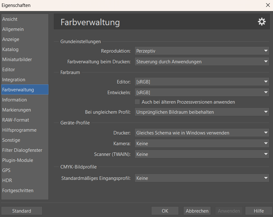 Standardmäßiges Eingangsprofil ist ein Farbprofil, das zur Konvertierung von CMYK in RGB bei Bildern verwendet wird, die kein Farbprofil enthalten. Wenn keines ausgewählt ist, wird ein Modus verwendet, der kompatibel mit älteren Programmen ist.