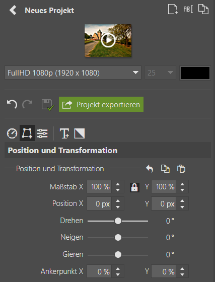 Damit sie verfügbar werden, muss zuerst auf der Zeitleiste ein Bild- oder Textclip markiert und auf das Symbol Position und Transformation im rechten Bedienfeld geklickt werden. Anschließend können sie auf zwei Arten gesteuert werden: